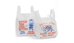 White Printed Vest Carriers - Printed 'Butchers' and 'Fish & Chips'