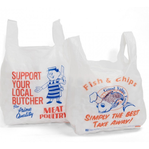 White Polythene Vest Carrier (Printed "Butcher" / "Fish n Chips")